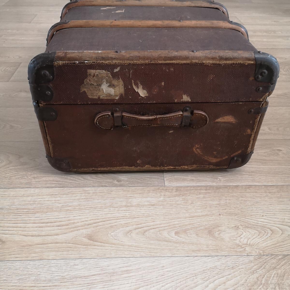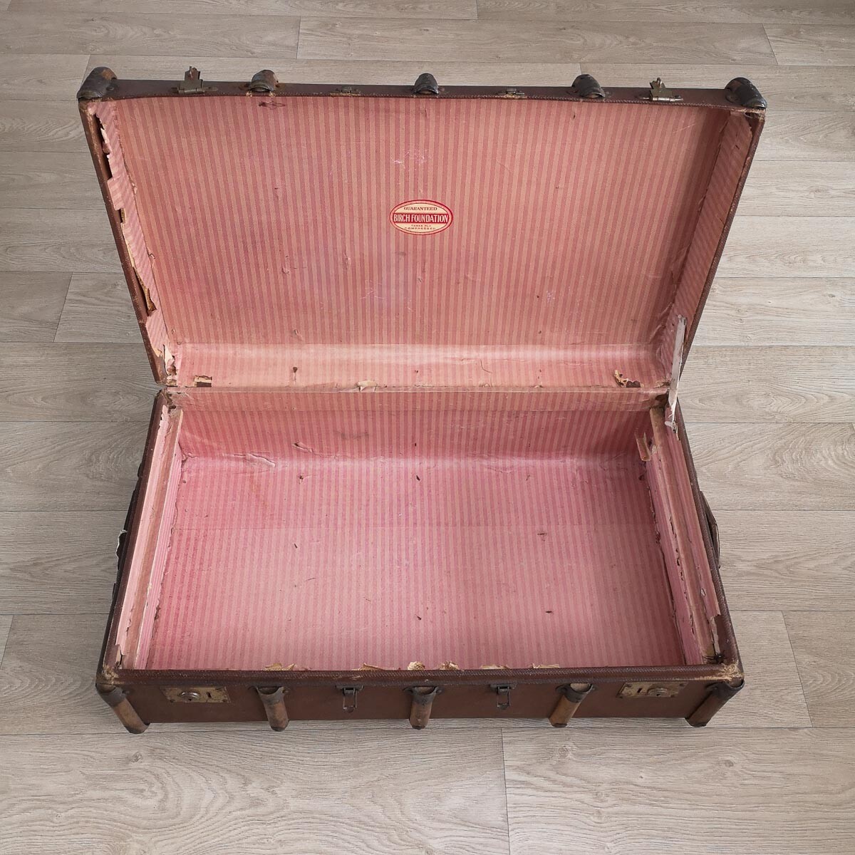 Malle cintrée début XXème; format cabine 90x33x54cm elle est recouverte d’une toile enduite. Elle est équipée de deux serrures et de ses trois poignées d’origine en cuir avec deux passants (une devant et une de chaque côté). Elle peut facilement s’empiler grâce à sa forme plate. Ouverture du capot à 90 degrés. A l’intérieur, elle a conservé son papier d’origine, couleur rose motif à rayures.
