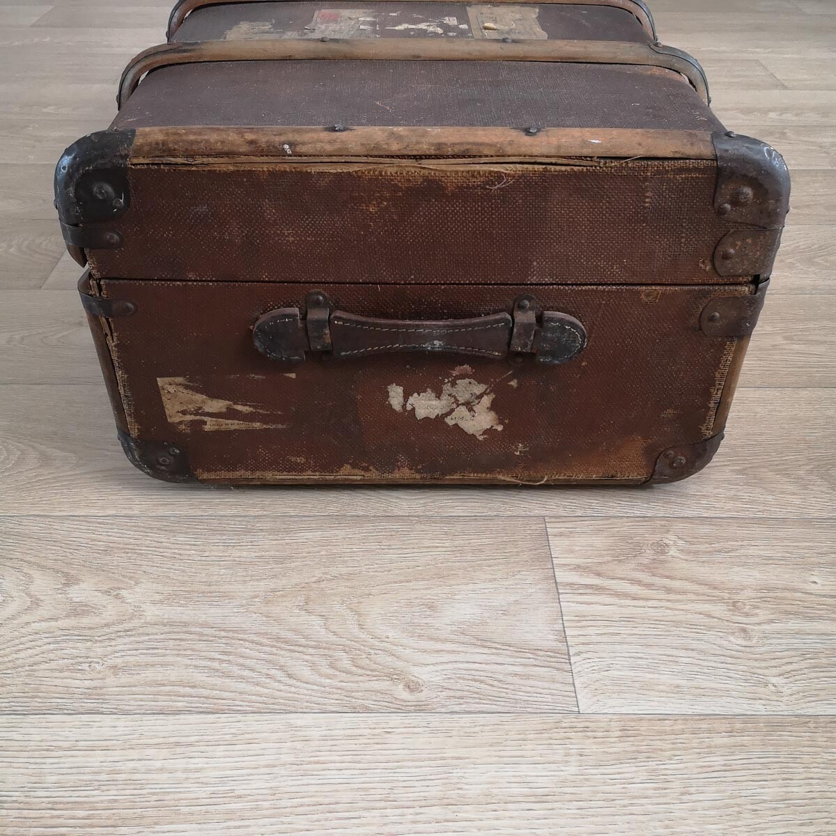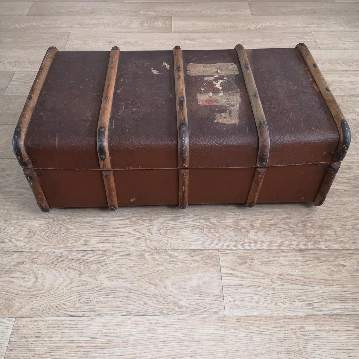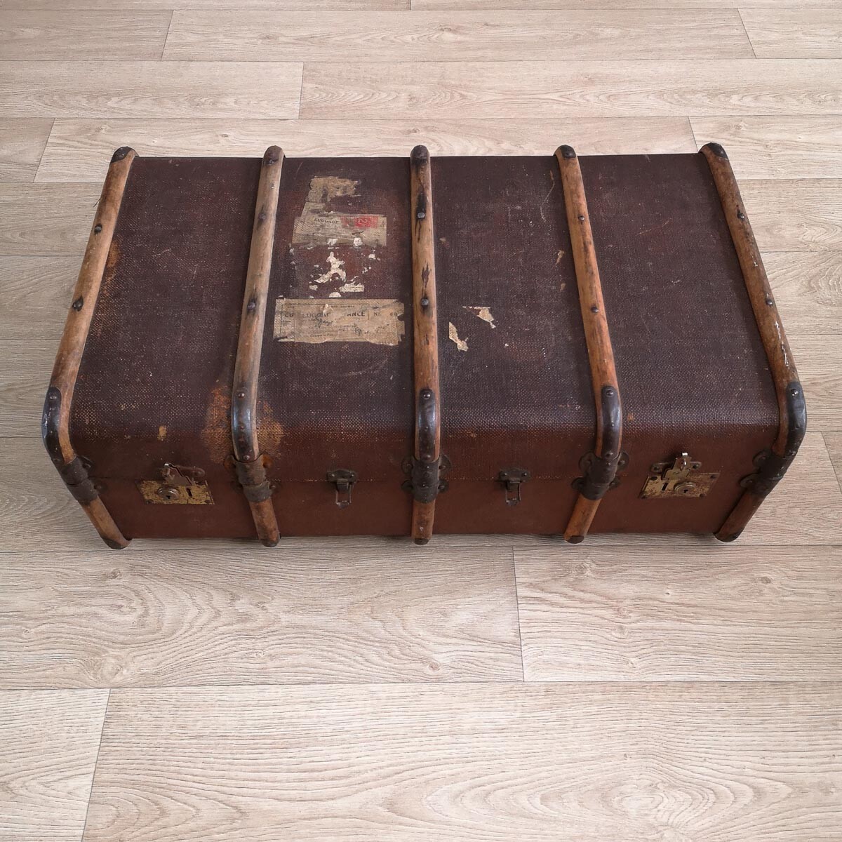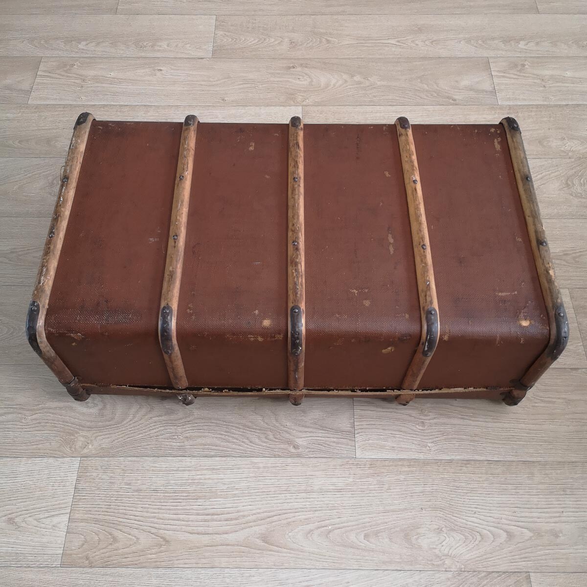 Malle cintrée début XXème ; format cabine 90x33x54cm elle est recouverte d’une toile enduite. Elle est équipée de deux serrures et de ses trois poignées d’origine en cuir avec deux passants (une devant et une de chaque côté). Elle peut facilement s’empiler grâce à sa forme plate. Ouverture du capot à 90 degrés. A l’intérieur, elle a conservé son papier d’origine, couleur rose motif à rayures.