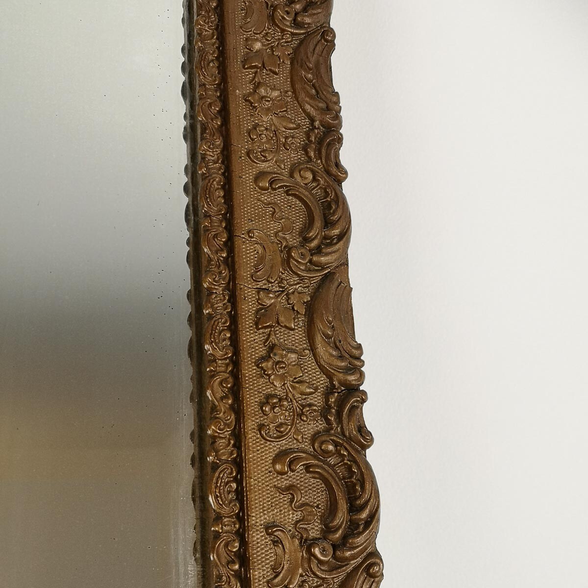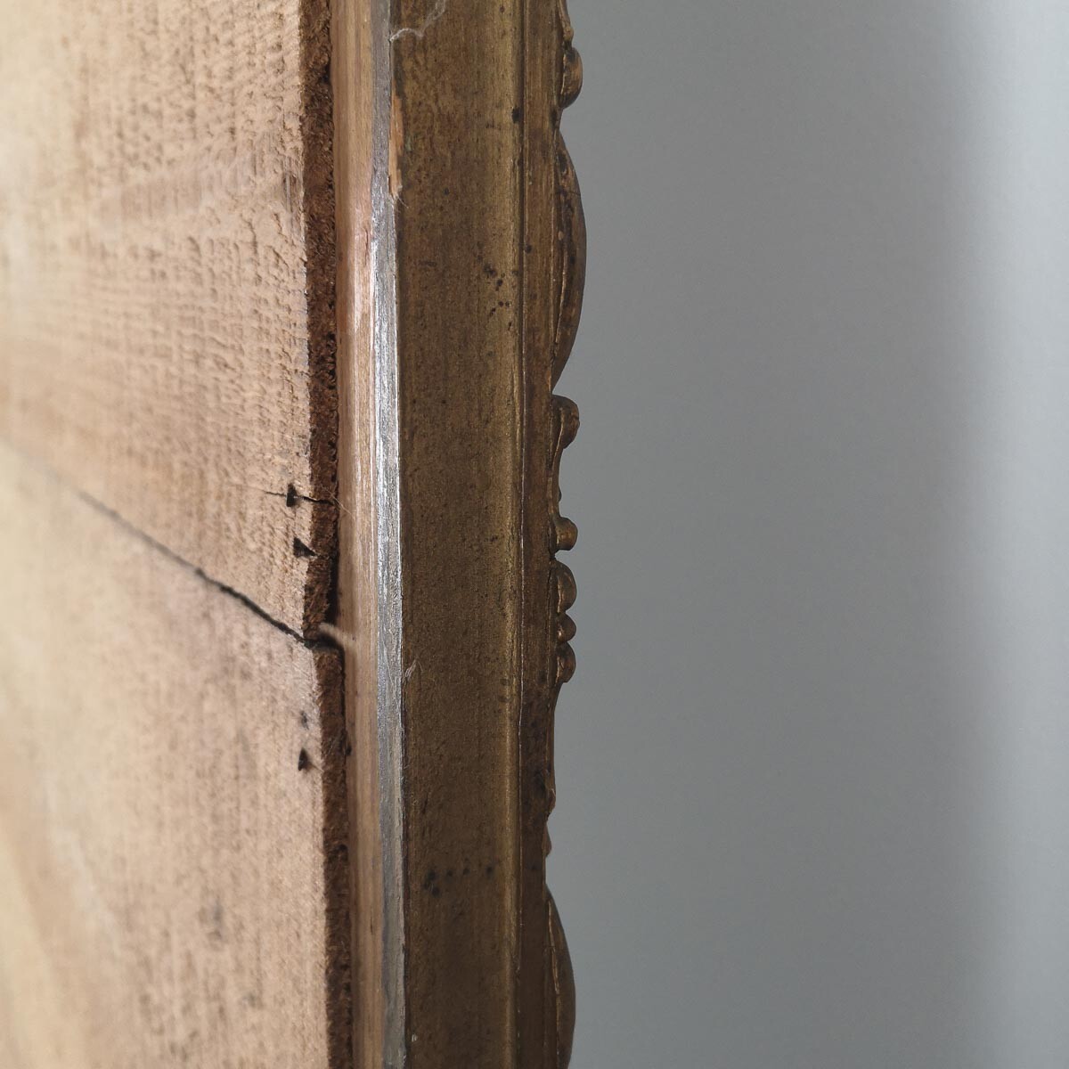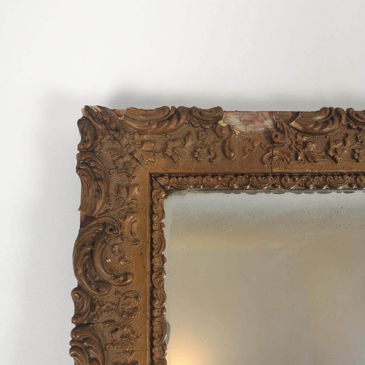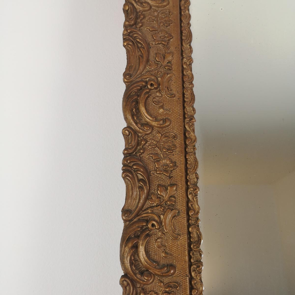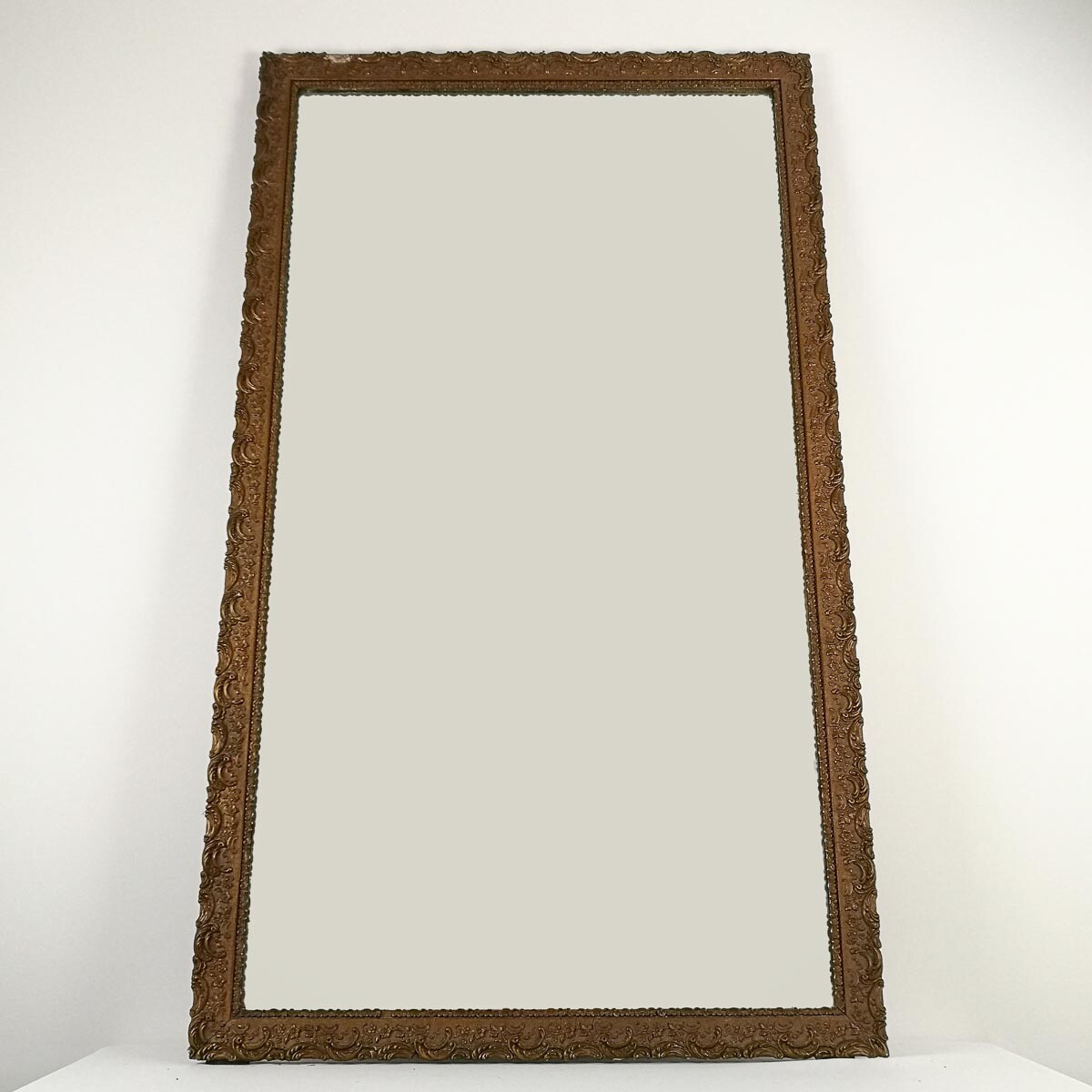 Grand miroir ancien de forme rectangulaire en bois et stuc doré décor de fleurs. Glace en bon état. Dos parqueté.