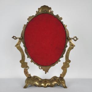 Rare modèle grand format. Miroir psyché en bronze doré. Décor coquille et angelot.